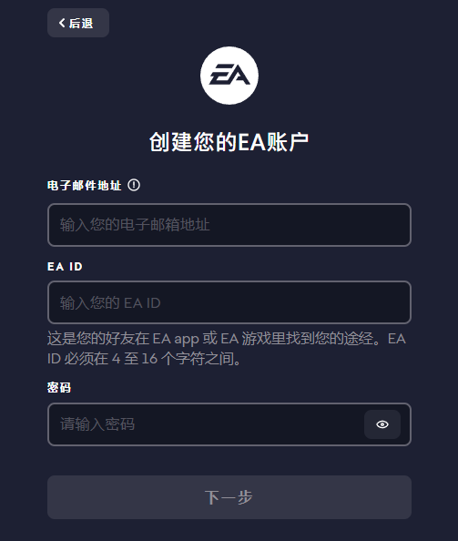 输入电子邮件地址,创建EA ID,设置EA账户密码