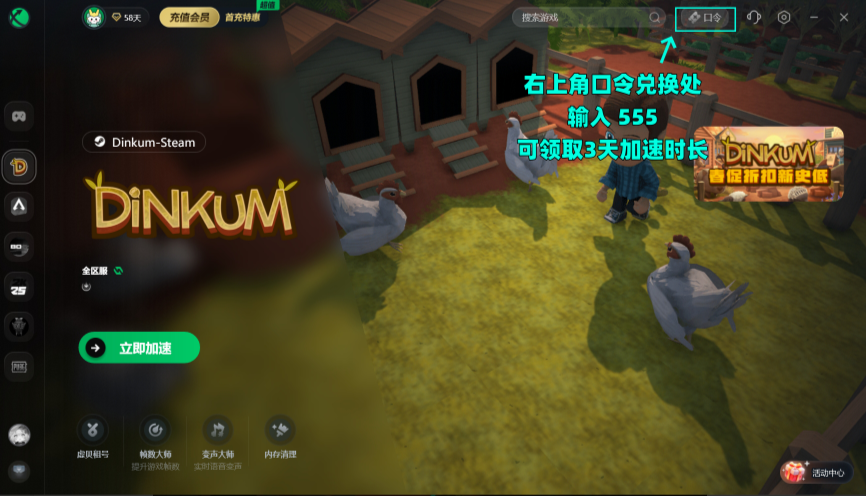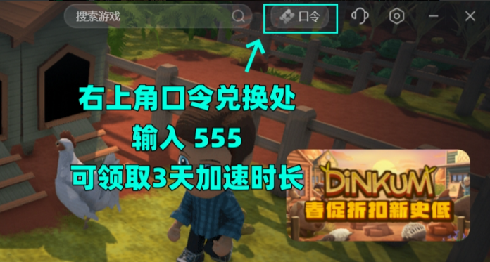点击右上角【口令兑换】输入口令【555】免费领取3天加速时长
