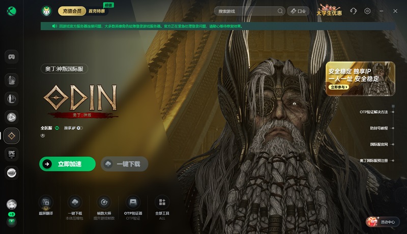 《奥丁神叛》国际服的服务器距离远,国内玩家直接连接的话,网络延迟高得很,信号还老是断,这就容易卡在登录页面进不去游戏。这个时候,可以使用迅游加速器来优化网络。打开迅游客户端,搜索并加速《奥丁神叛》国际服,加速完成后可以优化网络连接,减少延迟和丢包的情况,让网络连接问题,之后再重启游戏进行登录。在迅游加速器客户端点击“口令兑换”,输入“迅游好用”可以领取免费加速时长。另外迅游还针对大学生推出了优惠活动,有需要的可在客户端查看。