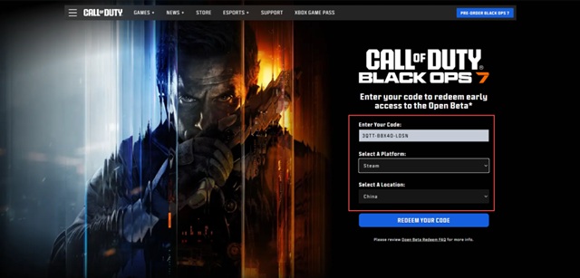 同样在兑换页面中,输入《使命召唤22》测试资格码,兑换平台选“战网”,再选择地区,点击兑换。兑换时就需要绑定战网平台账号。