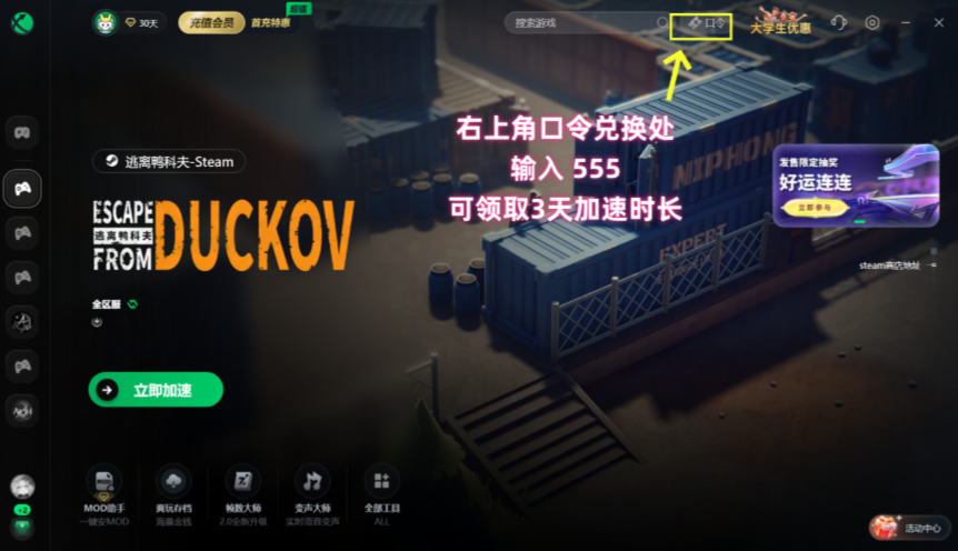 首先由于逃离鸭科夫在steam上线需要大家拥有很好的网络环境,然后小编建议大家下载安装使用迅游加速器对《逃离鸭科夫》进行加速即可,这样一方面可以帮助大家快速登录steam,另一方面帮助大家快速体验到游戏MOD,另外迅游加速器免费加速steam等各大游戏平台。