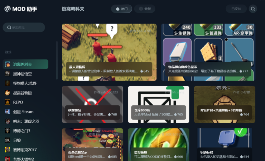 在打开MOD助手后大家可以看到这里面有各式各样的MOD能够帮助大家在游戏中获得更好的游戏体验,直接下载安装体验即可。