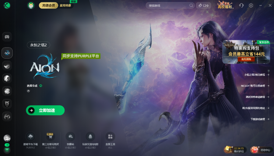 防止服务器距离较远,玩家无法进入官网、下载注册失败,可以先优化游戏服务器连接。打开迅游加速器,右上角搜《永恒之塔2》打开,一键优化游戏服务器连接。