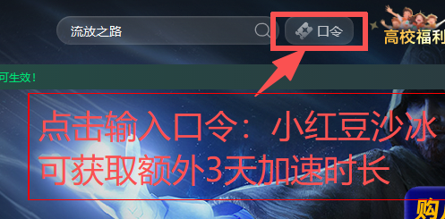 点击右上角【口令兑换】输入口令【小红豆沙冰】免费领取3天加速时长