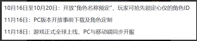 10月16日至10月20日:开放"角色名称预定",玩家可抢先锁定心仪的角色