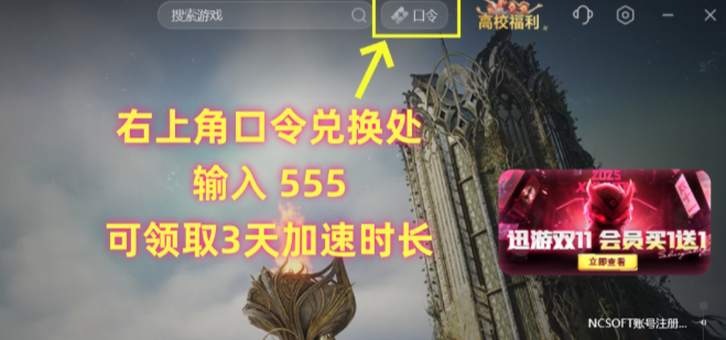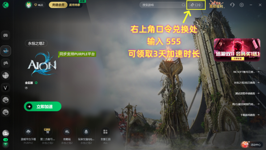 右上角口令兑换处输入【555】可领取3天加速时长