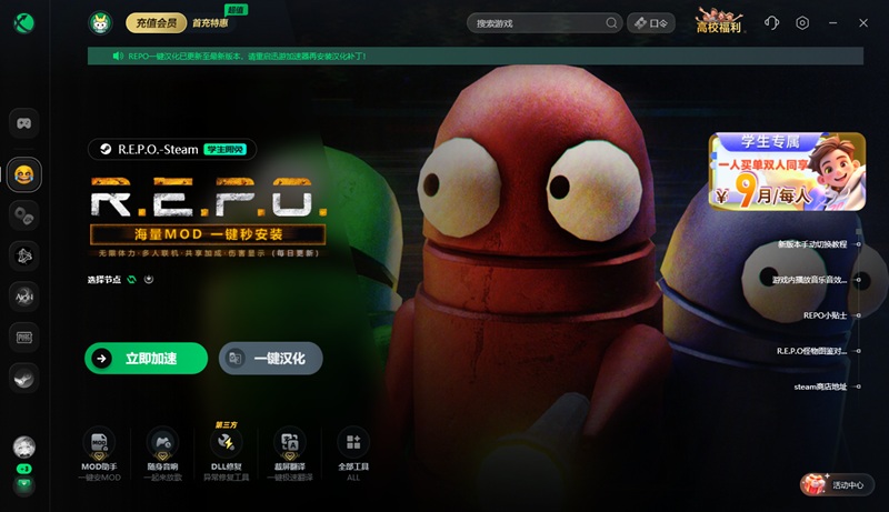 加速完成后,在迅游加速《r.e.p.o.》游戏专区界面,点击“一键汉化”工具。