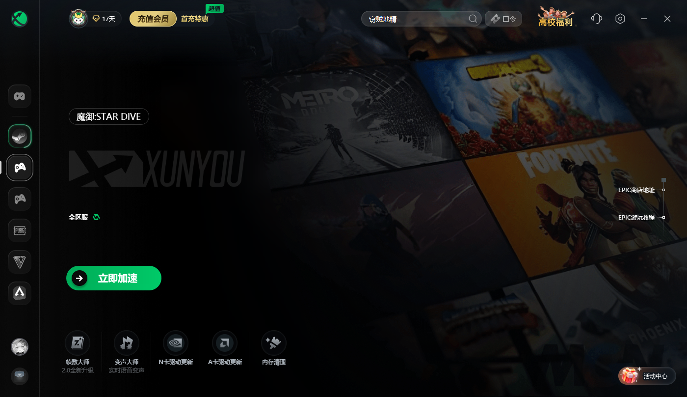 先下载安装迅游加速器客户端,登录后在搜索栏输入“魔御:STAR DIVE”,找到对应游戏后点击一键加速,加速器会自动匹配当前所在地区最优的海外加速节点,优化数据传输路径、降低网络丢包率与延迟,待加速成功提示弹出后,直接从加速器内启动游戏,或重启已打开的游戏客户端,即可明显改善延迟高、无法连接服务器、加载卡顿等问题,即便在晚间网络高峰时段,也能保障游戏数据稳定传输。