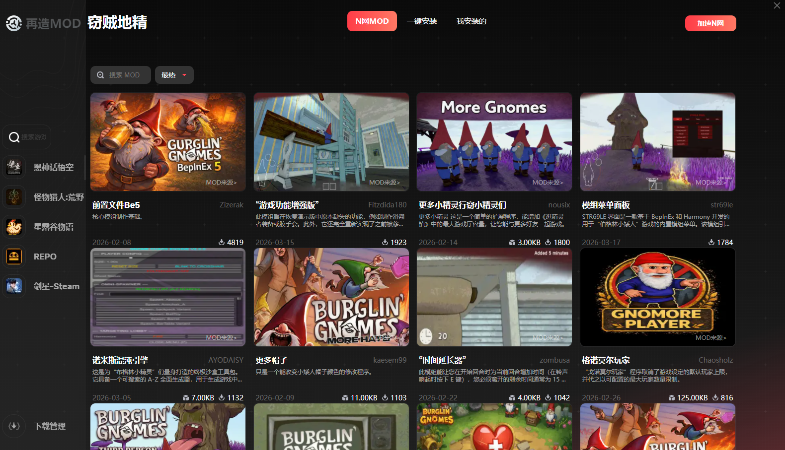 进入【MOD助手】后,可看到海量适配BurglinGnomes的MOD资源,涵盖趣味玩法、画面优化、角色皮肤等类别,每款MOD都标注了适配版本、功能介绍和用户评价,可根据自身需求筛选;