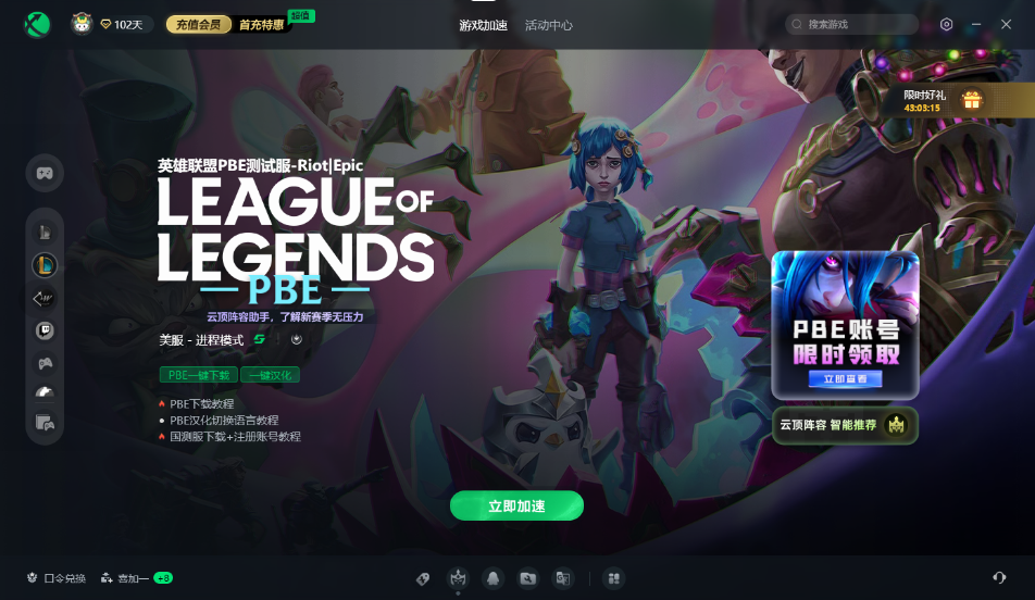 建议大家使用迅游加速器,进行网络优化,这样就可以流畅登录PBE体验新赛季了。