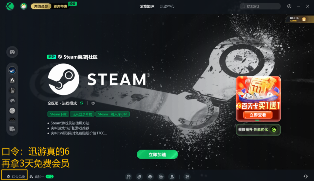 点击左下角【口令兑换】输入口令【迅游真的6】免费领取3天加速时长