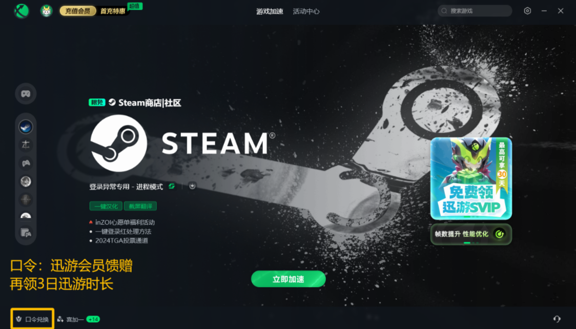 点击左下角【口令兑换】输入口令【迅游会员馈赠】免费领取3天加速时长