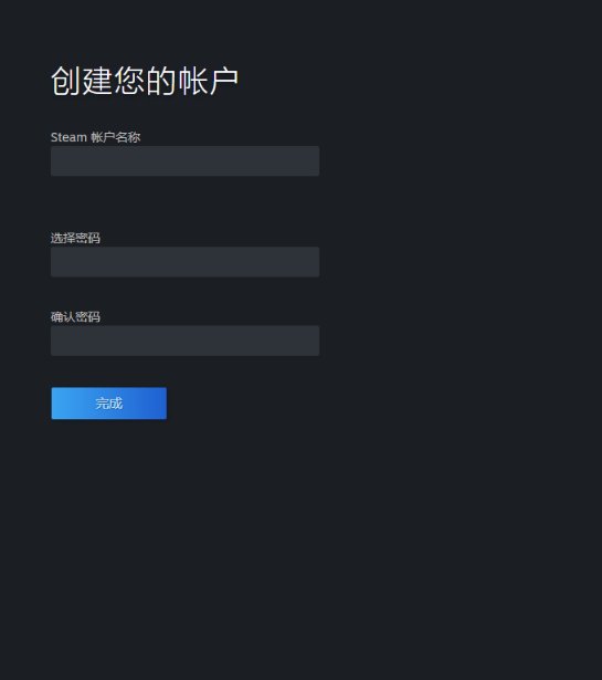最后就是设置steam的账号密码,设置自己熟悉的能记住的就好,然后点击完成就注册成功,可以登录了。