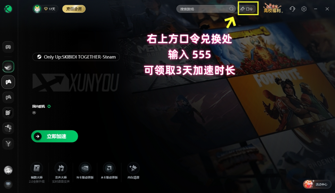 在试玩和联机之前大家需要检查自己的网络环境是否稳定,在网络稳定的环境下前往迅游加速器官网下载并安装迅游加速器客户端,打开后搜索《Only Up一起脑残》进行加速即可,这样一方面大家可以快速登录steam并找到该游戏,另一方面帮助大家快速联机,获得最佳的游戏体验。