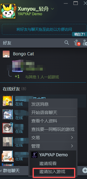 在游戏中,我们打开steam好友界面,找到想要一起玩的好友,点击右键邀请加入游戏就可以联机一起玩了!