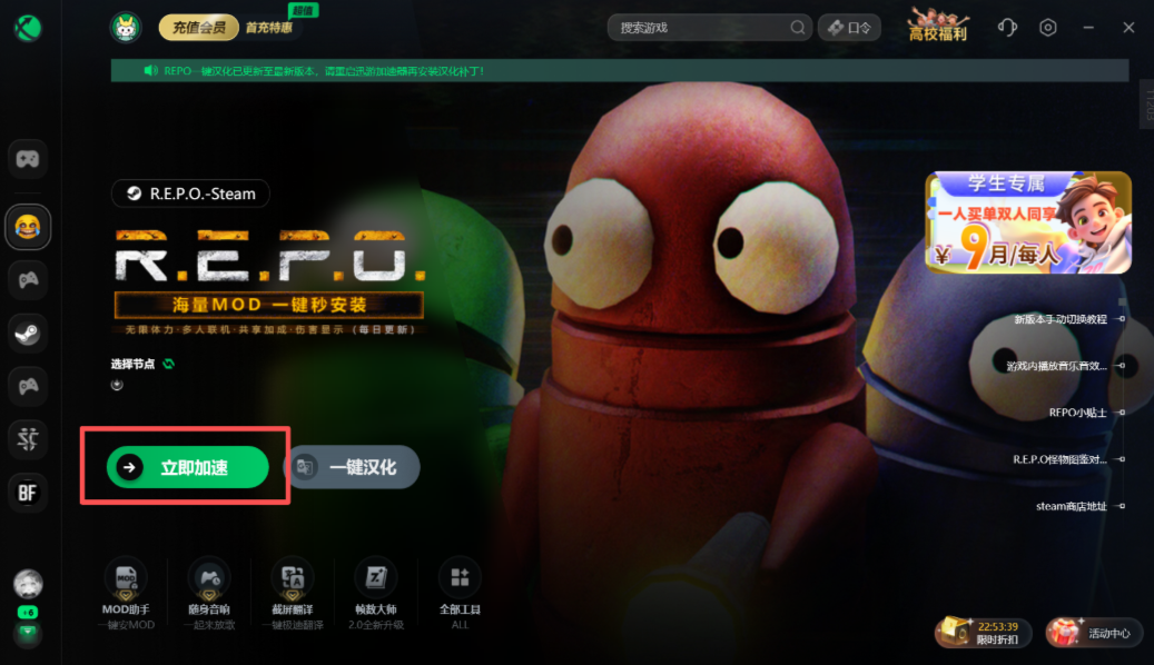 进入迅游加速页面,点击【一键汉化】即可下载安装汉化MOD
