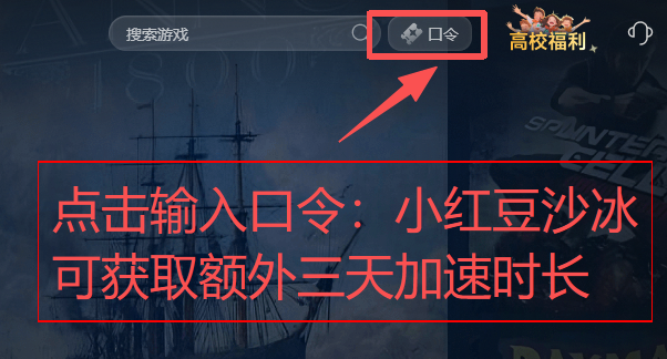 点击右上角【口令兑换】输入口令【小红豆沙冰】免费领取3天加速时长