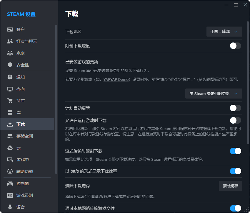 Steam客户端默认自动选择下载地区,若所选地区服务器距离较远或负载过高,会导致下载速度慢。玩家可手动切换至距离更近、负载更低的国内或周边地区服务器,操作时打开Steam客户端,点击左上角“Steam”菜单,选择“设置”,找到“下载”选项,在“下载地区”下拉菜单中选择“北京”“上海”“香港”等近地节点,避免选择纽约、伦敦等海外高峰节点;同时,取消“限制带宽”勾选,将带宽设置为“无限制”,避免误触限速导致速度受限;设置完成后点击“确定”保存并重启Steam客户端,使设置生效。