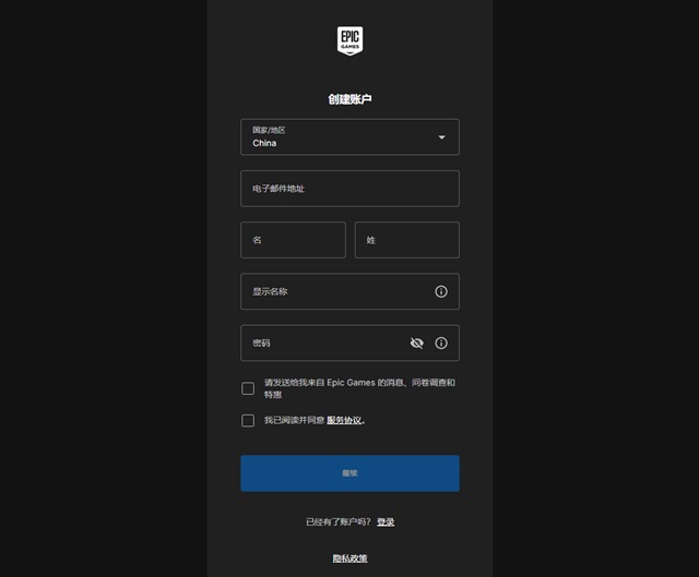 仔细阅读并勾选同意Epic Games的条款和条件及隐私政策。