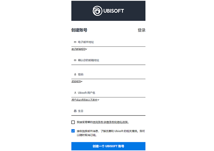 2、进入育碧官网注册页面