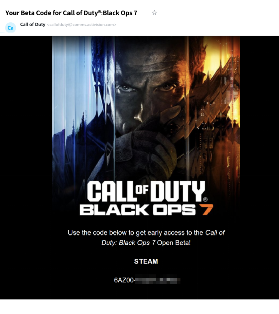 4.注册动视账号的邮箱在9月30日后会陆续收到对应平台的激活码,请届时检查邮箱,使用这个平台限定激活码去指定的平台激活,例如:选择了steam平台,即可去steam平台进行兑换。