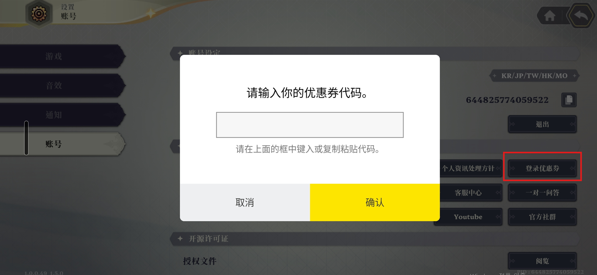 然后点击右方的登录优惠卷,然后输入收到的礼包码点击确认即可