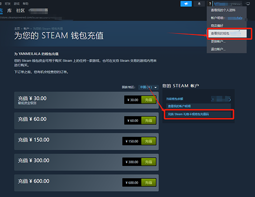 2.登录STEAM→右上角点击账户明细→点击钱包充值→兑换 STEAM 礼物卡或钱包充值码→复制CDK→兑换成功→STEAM官方消费。