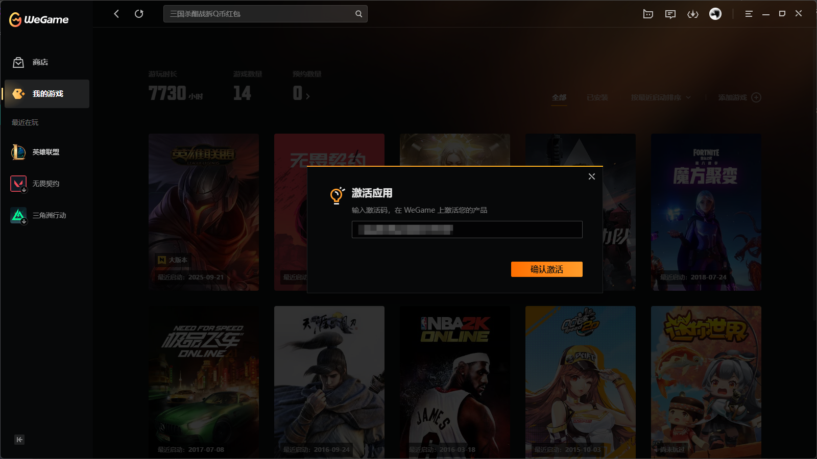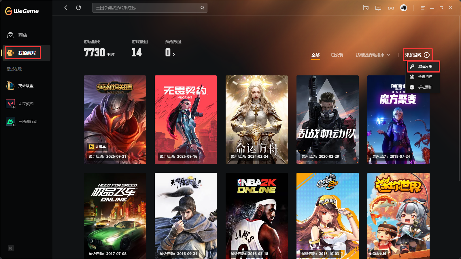 1.打开WeGame并且登录,点击“我的游戏”-“添加游戏”-“激活应用”