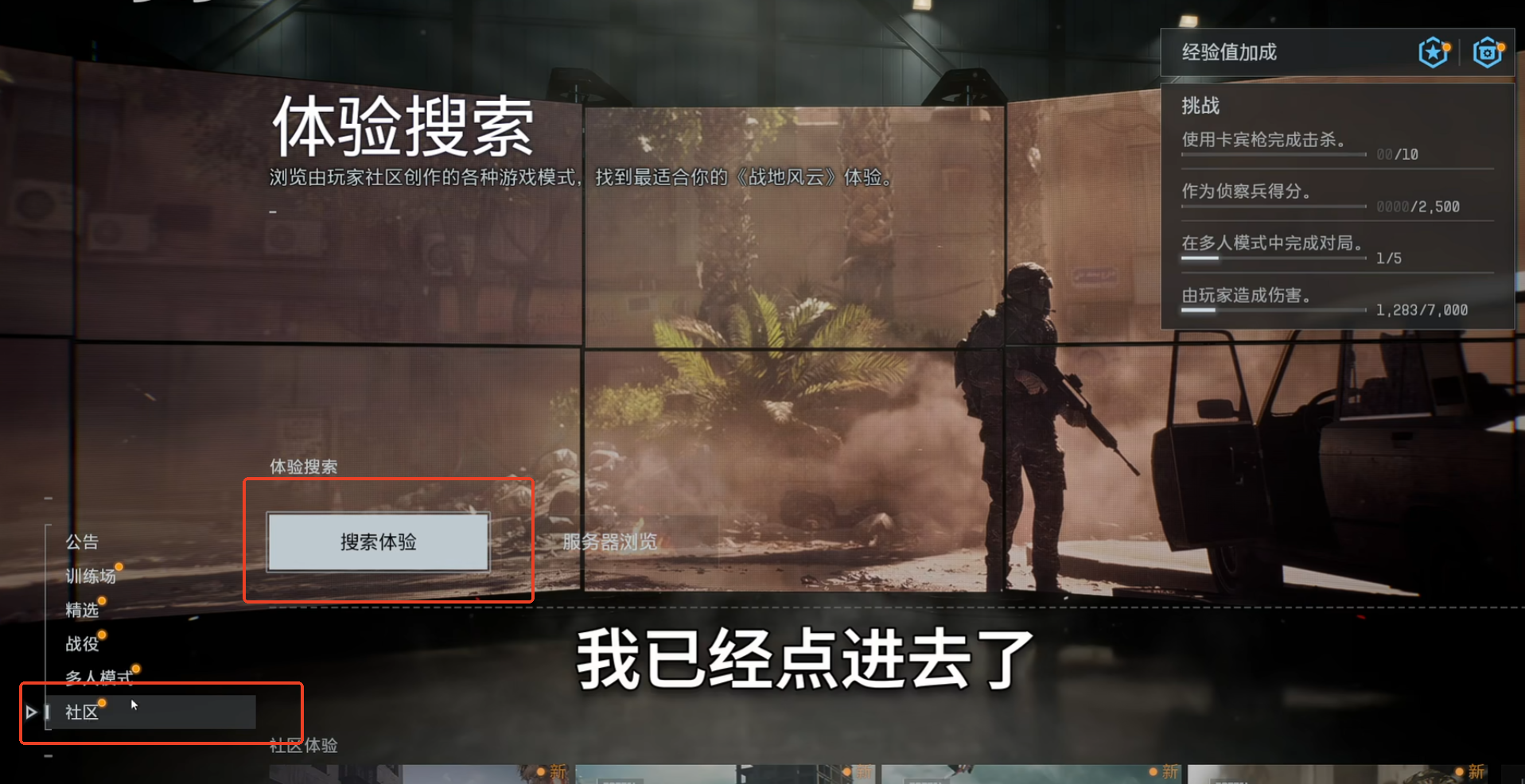 然后打开游戏,在游玩页中 找到社区选项,再点击搜索体验