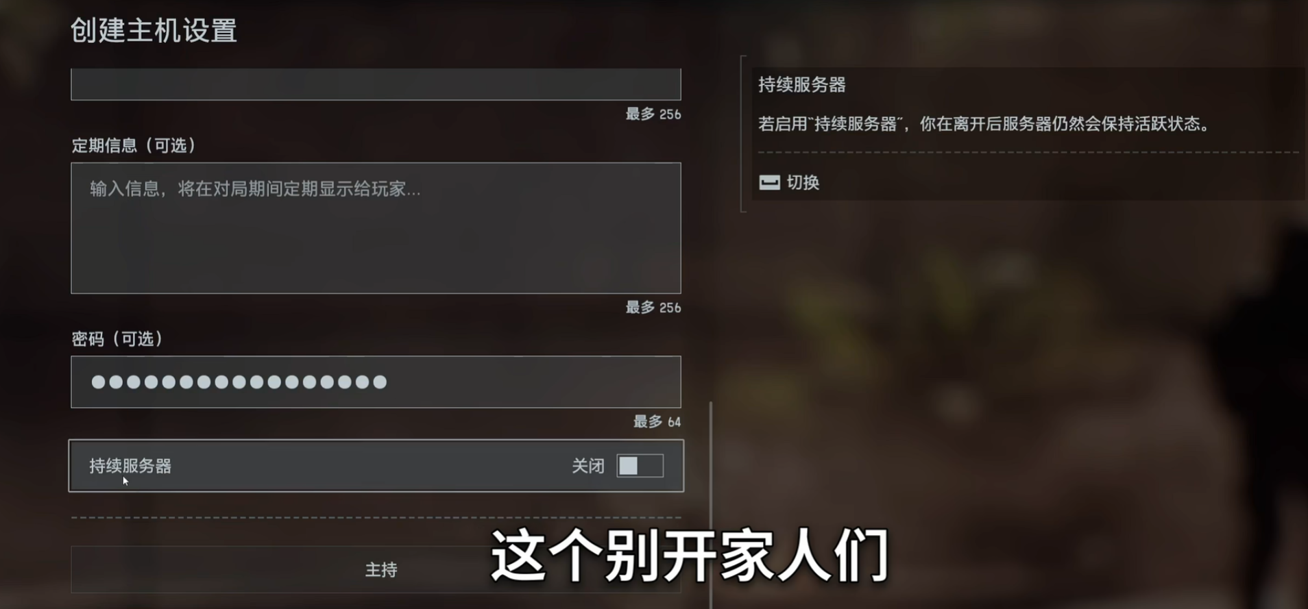 然后下滑设置一个自己的密码,并且关闭持续服务器,然后点击主持即可