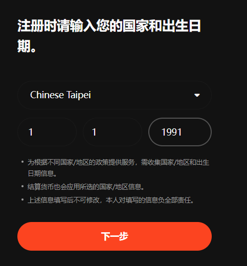 3.地区选择Chinese Taipei(中国台北),年龄需要成年,点击下一步