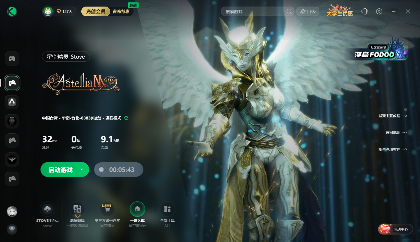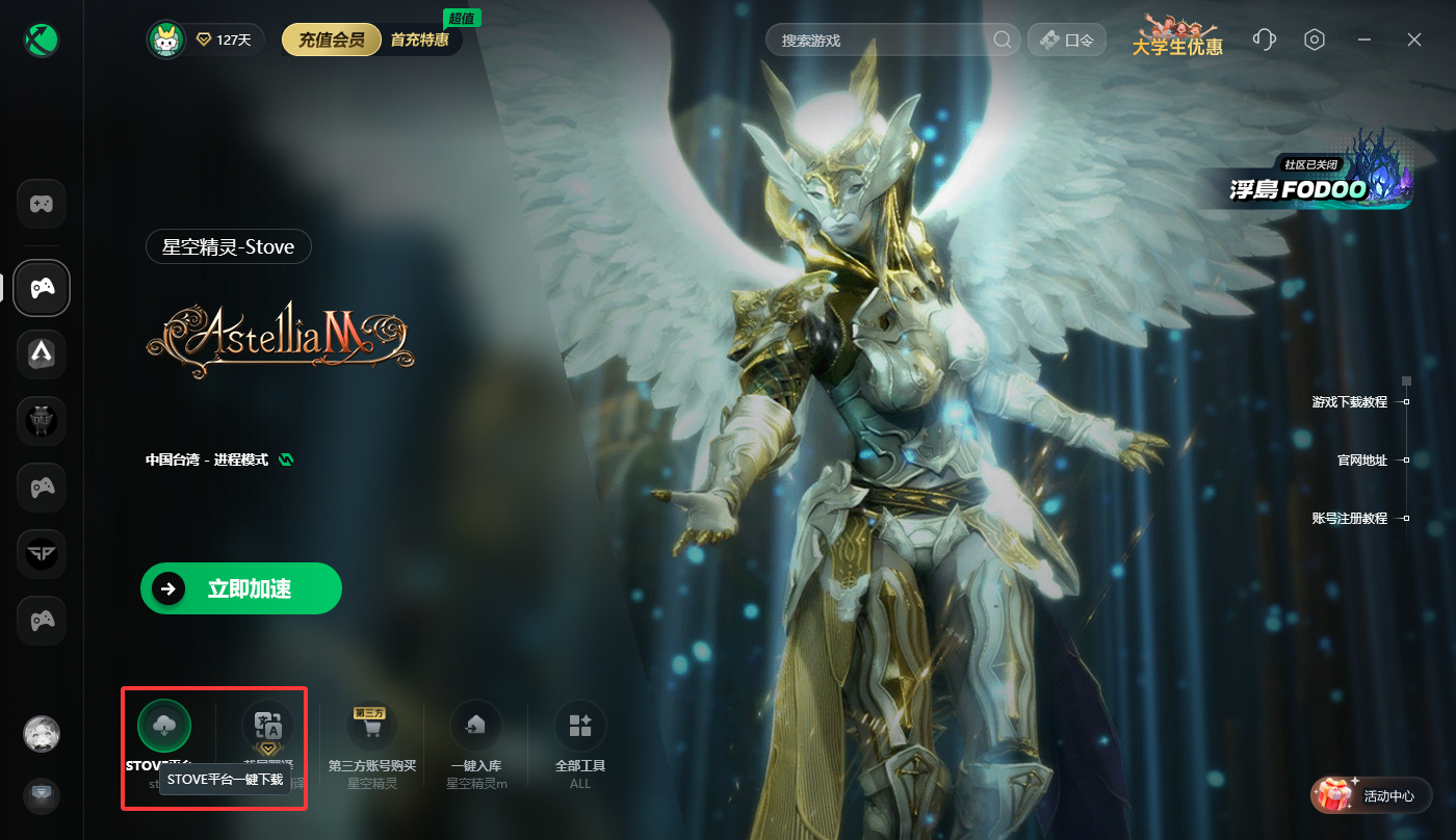 1.打开迅游,加速游戏,点击链接: https://astellia.game.onstove.com/tw 进入游戏官网,登录台服账号,若无账号可点击右上角注册会员