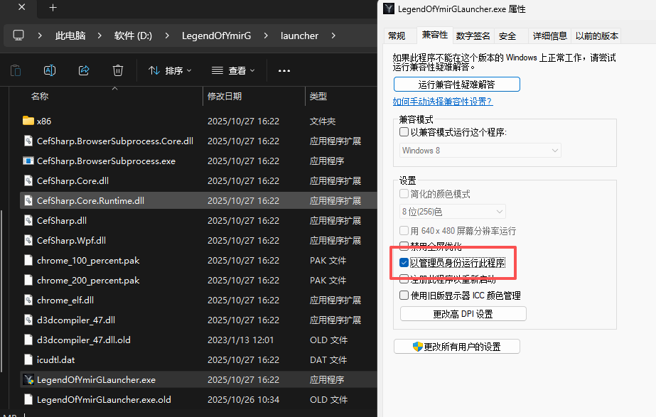 7.若无法拉起游戏客户端,请进入安装目录,找到LegendOfYmirGLauncher.exe,右键-属性-兼容性,设置为以管理员身份运行,再打开客户端