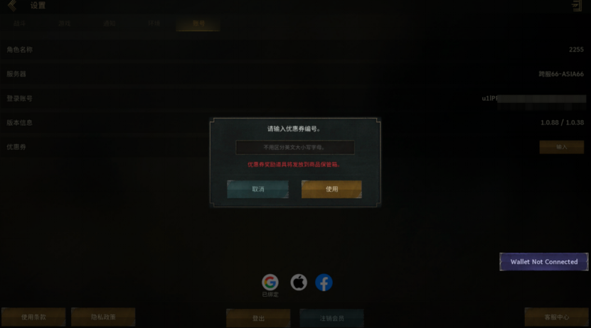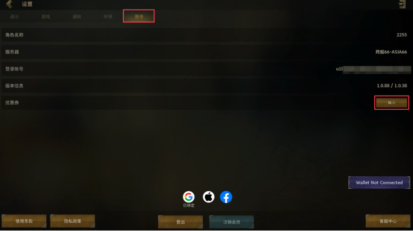 三、进入设置界面后,选择「账号」界面,在优惠券栏即可输入兑换码