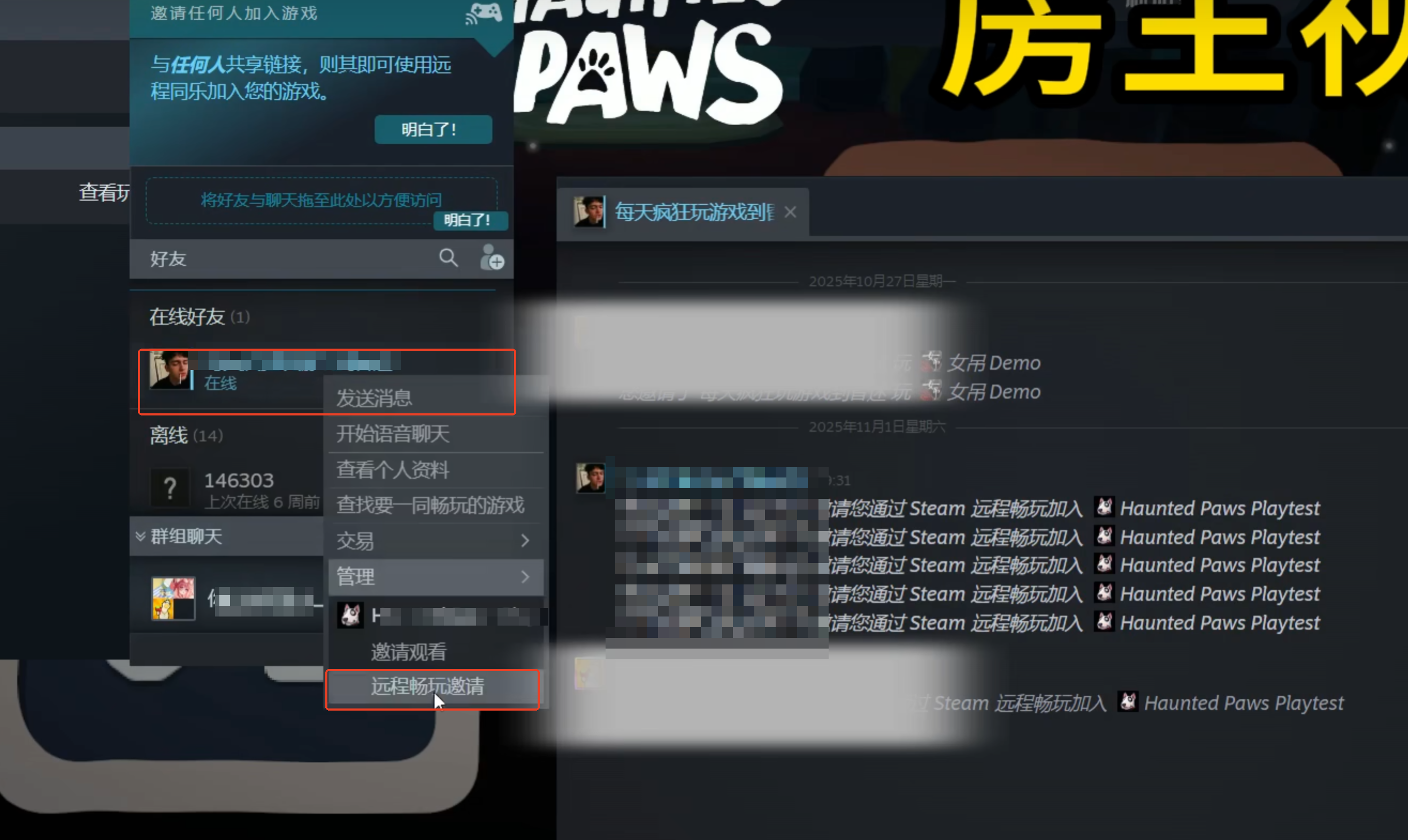 然后shift➕tab键一起按呼出好友,右键其头像然后点击远程畅玩邀请