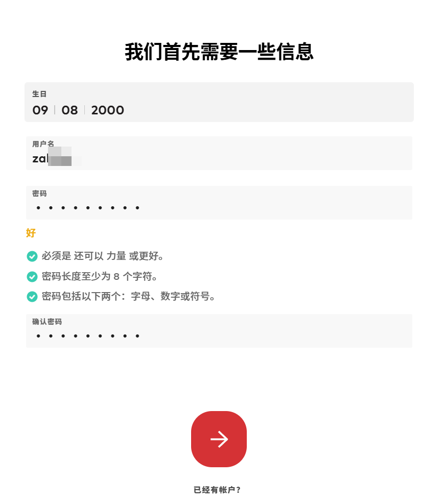 随后完成验证码,密码设置,生日设置,确认服务条款即可完成注册