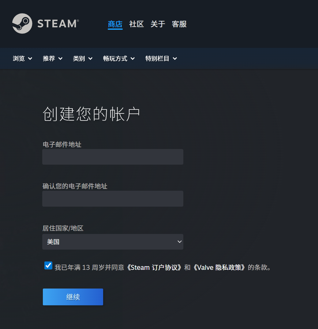 然后 点击此处 跳转到steam官网页面进行注册,在此输入自己的邮箱账号后完成注册即可