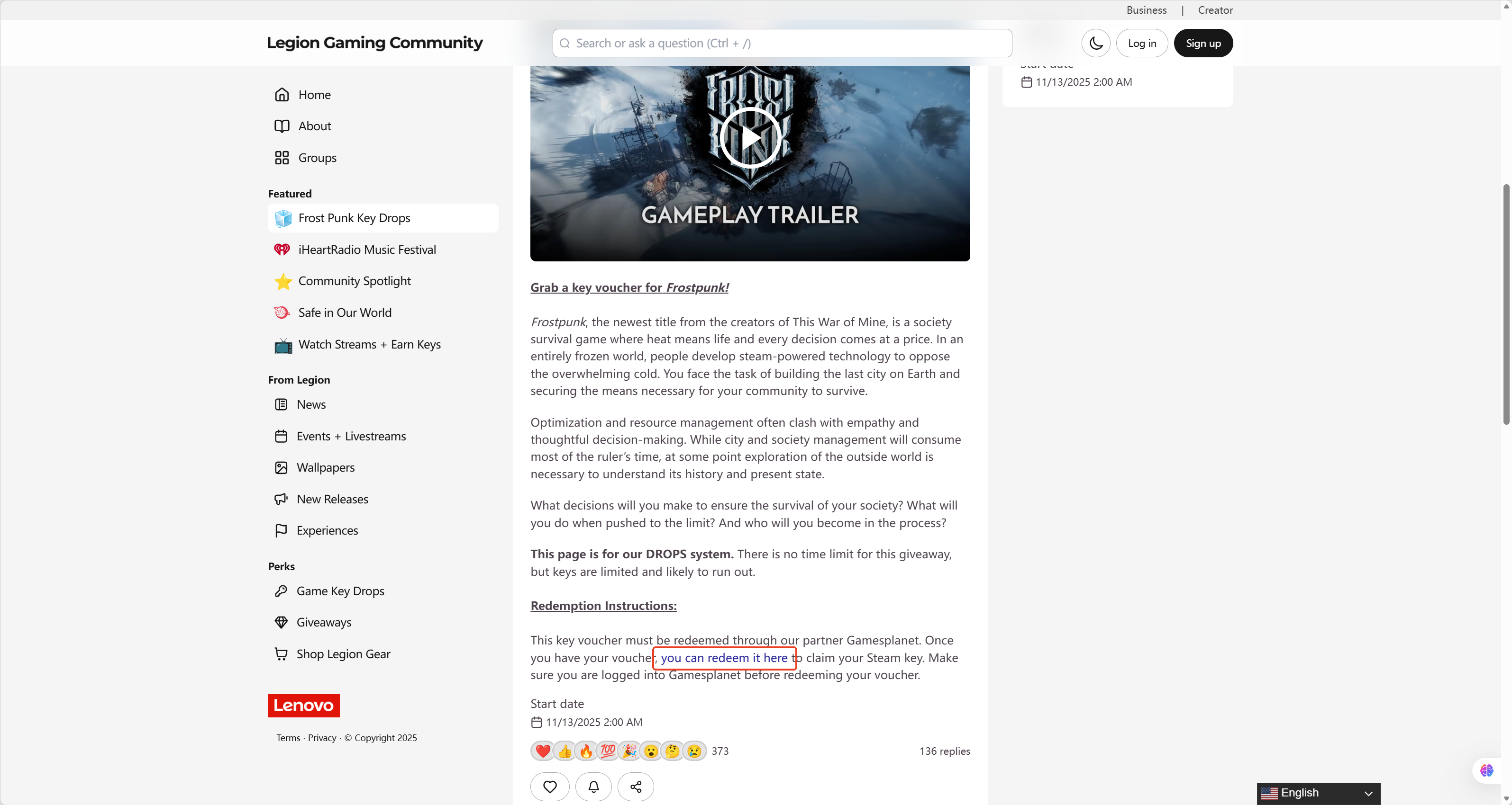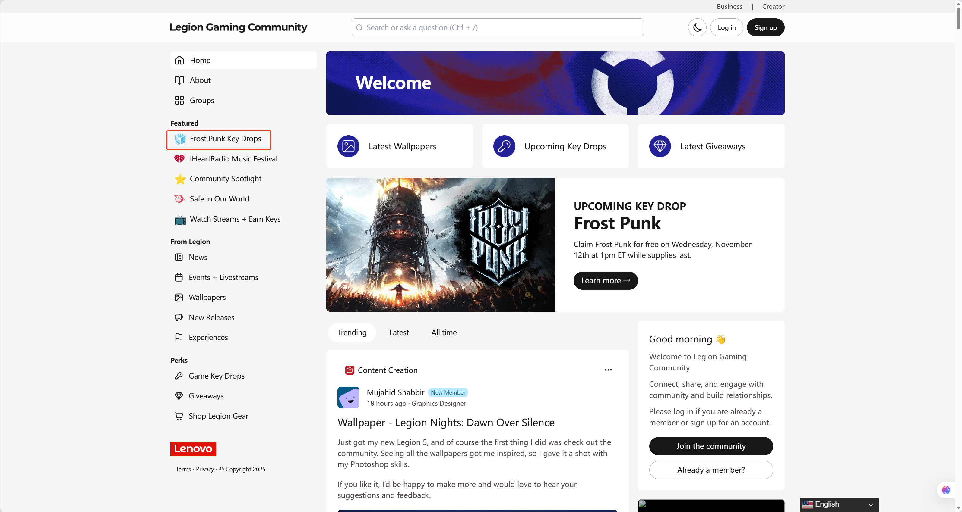 1.用迅游加速Legion Game Store,然后进入联想游戏中心网页:Explore the Ultimate Gaming Community Hub,点击Log in进行登录;若未注册,点击右侧的Sign up进行注册。
