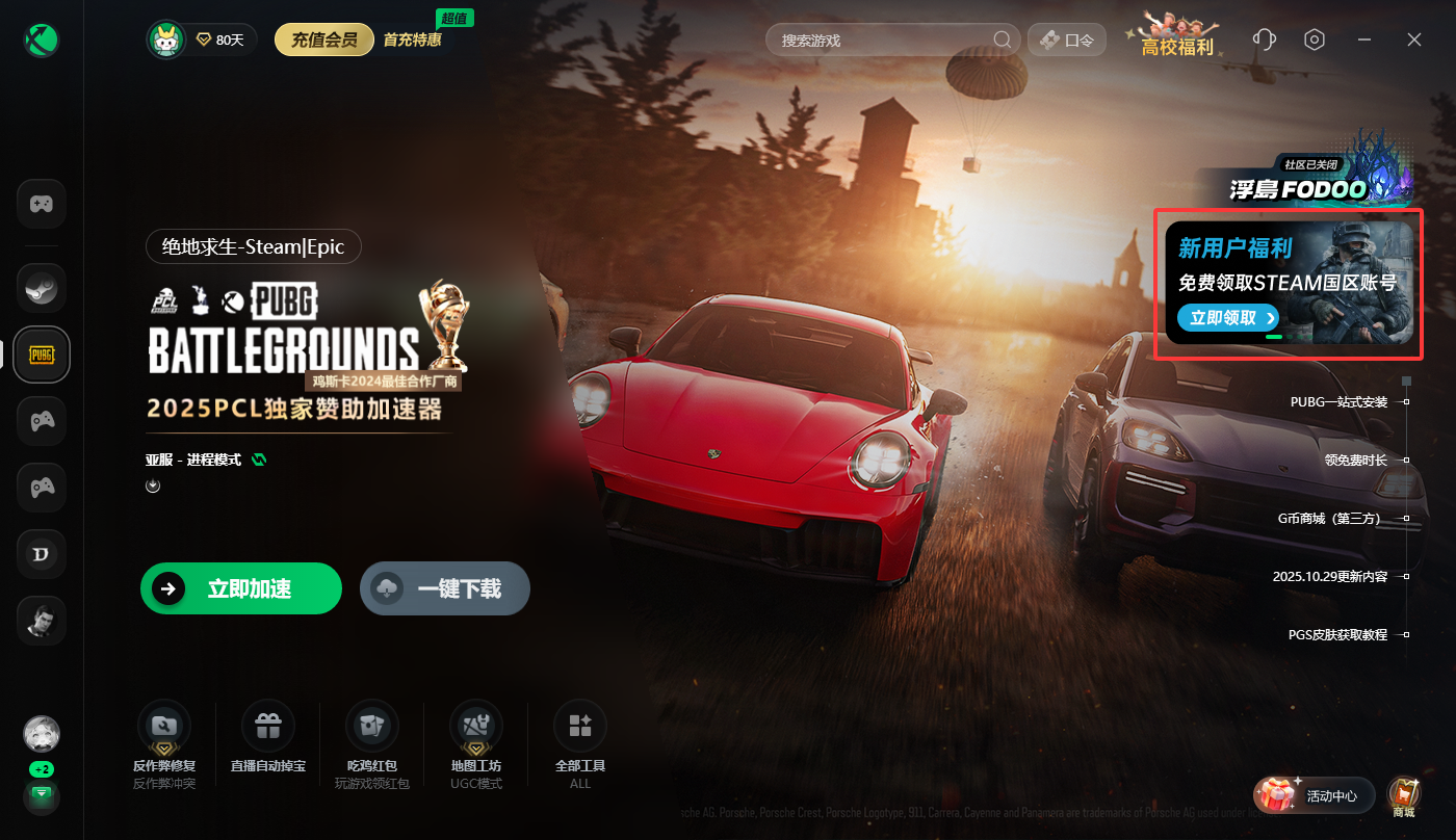 4.等待Steam自动更新完毕,打开迅游右上角新用户福利活动,免费领取Steam国区账号(请妥善保存),打开Steam客户端,输入获得的账号和密码