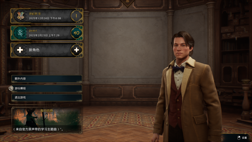 3.进入游戏,您将看到有一个名为“DAM F”的角色存档,此即通过工具上传的“所有挑战、收藏和成就存档”。除小部分隐藏成就外,只要和韦斯莱教授聊一聊就能解锁其他全部成就。