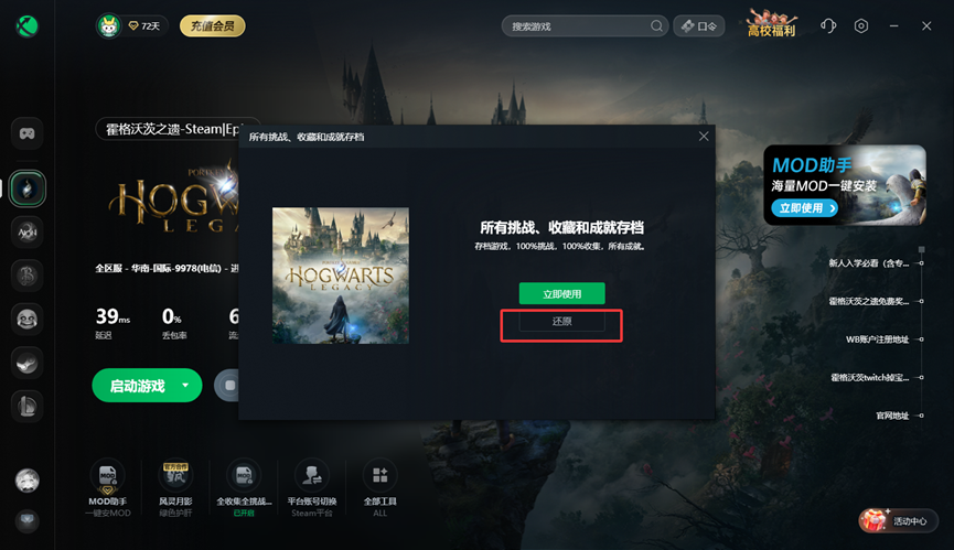 4.(可选)若您在完成第一步和第二部登录游戏后没有看到新存档出现在下方,您可尝试点击工具中的还原按钮并在再次“立即使用”该工具后重新执行第一步和第二步的步骤。若还是无法看见新的存档,您可在确认游戏进程关闭的情况下通过
