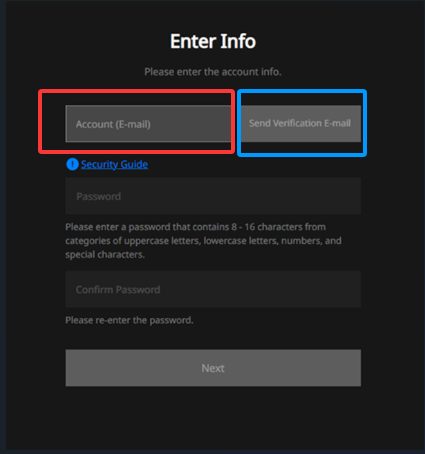 来到enter info页面,在红框圈出的地方填入您的邮箱地址,在填写完毕后点击旁边蓝框圈出的按钮,系统会向您的邮箱发送确认邮件,请及时前往您的邮箱界面确认。