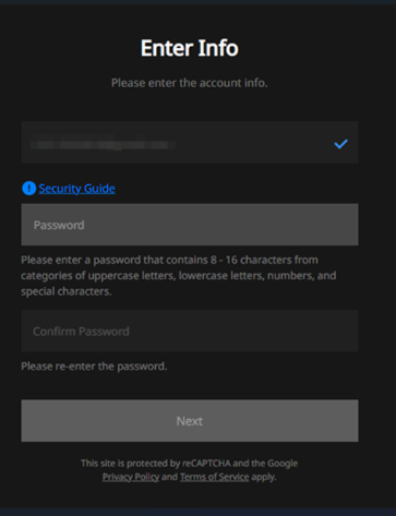 验证成功后您就可在“password”框内输入您的密码,并在下一个框内再次输入密码确认密码是否正确。(请注意:您的密码应当长度为8到16个字符,且密码包含大写字母、小写字母、数字和特殊字符类别。)