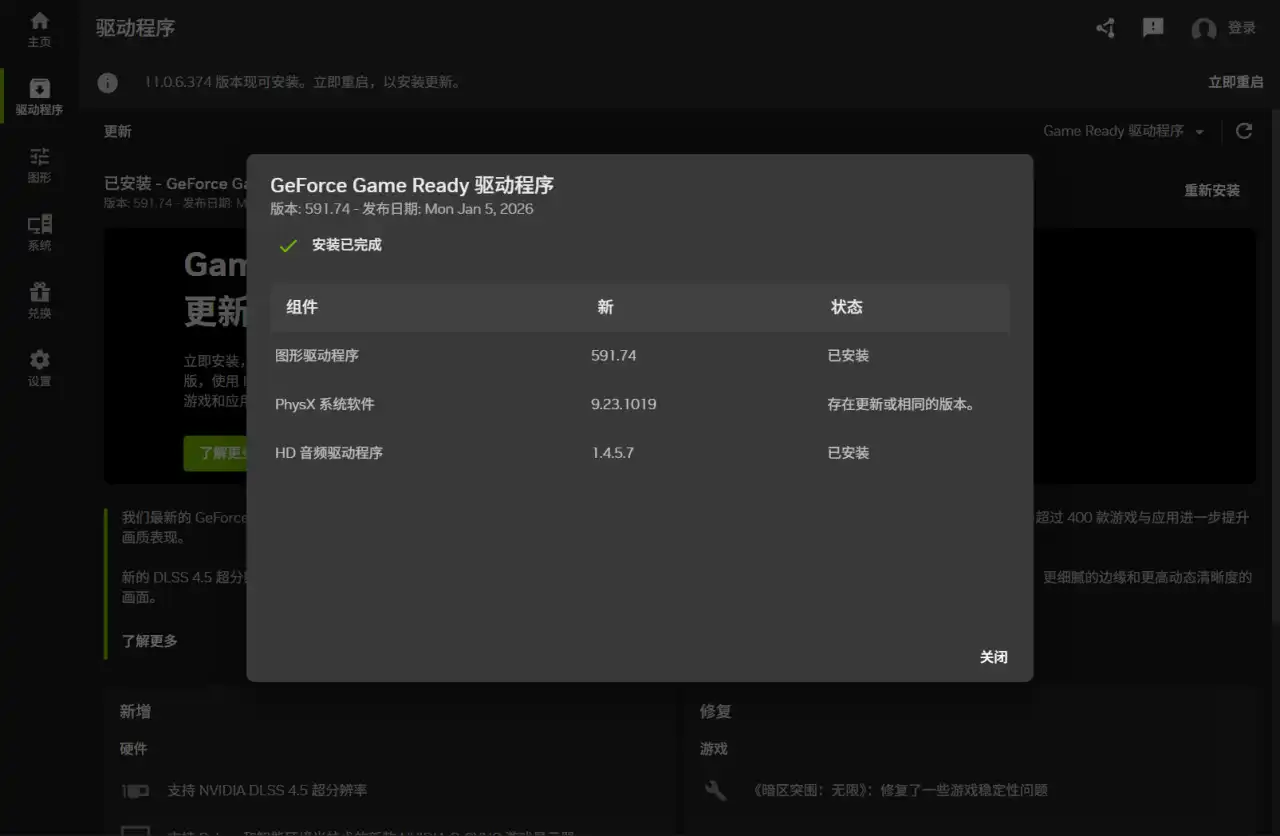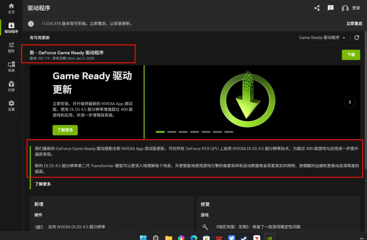 4.装好驱动后,重启NVIDIA APP。重启之后,你就可以看到它的标识写了11.0.6的版本亮点,支持DLSS 4.5。