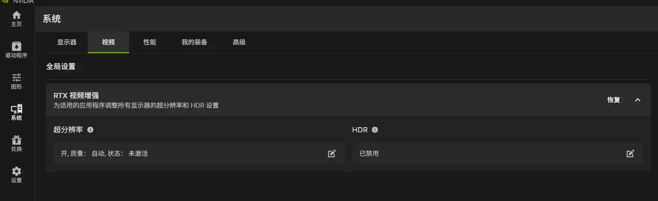 哦,对了,顺带一提,之前一直心心念念的RTX VSR视频超分辨率功能,还有自动HDR功能,在NVIDIA APP的“系统”选项卡的“视频”设置里面。