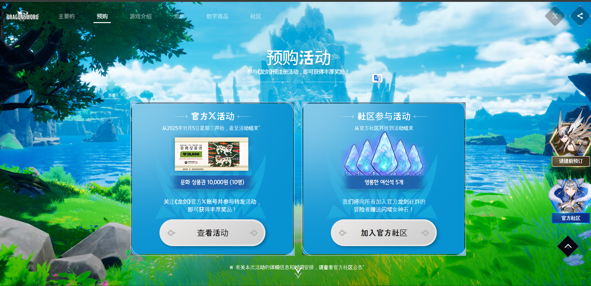 回到预约注册页面,鼠标向下滚动,您在完成预约后还可进行团体投票和角色测验等开服预约活动。来到预购活动页面您还可参与官方的社区活动获取更多预约奖励。