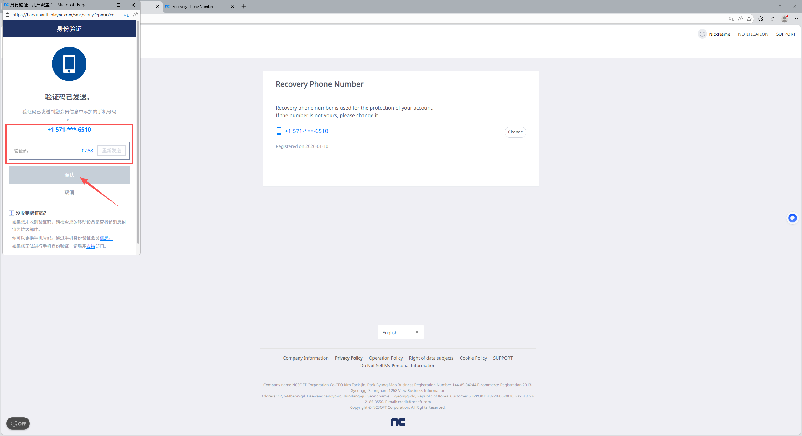 7.到此处后打开短信接收的链接,选择中间的6位验证码输入