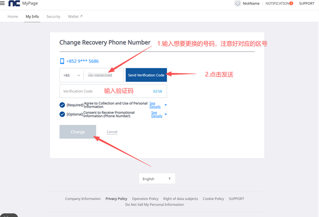 8.输入想要更换的号码以及收到的验证码,点击change