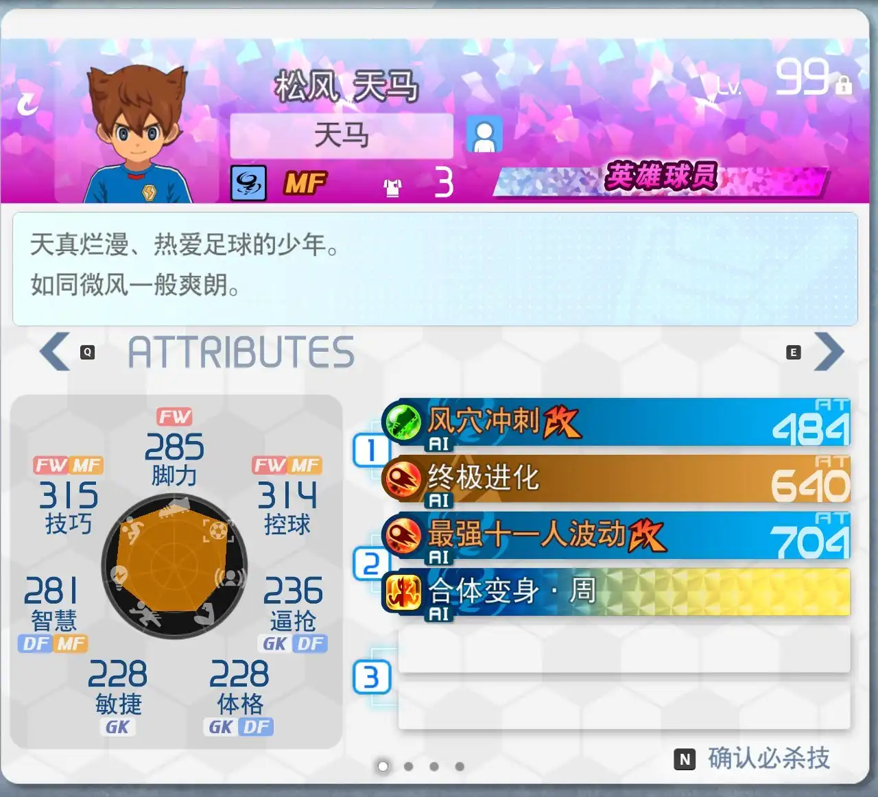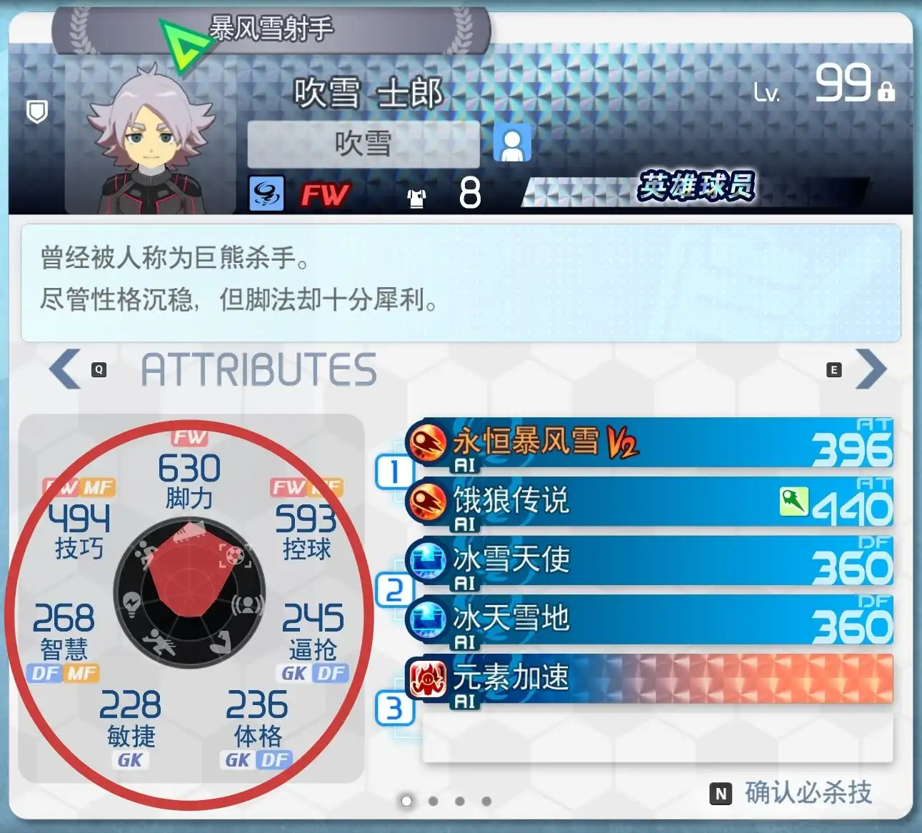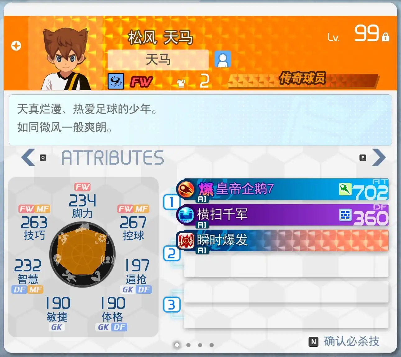技巧:指和对手比拼时要用到的足球技术,对于中场非常重要,能增加集中模式AT、DF的数值,