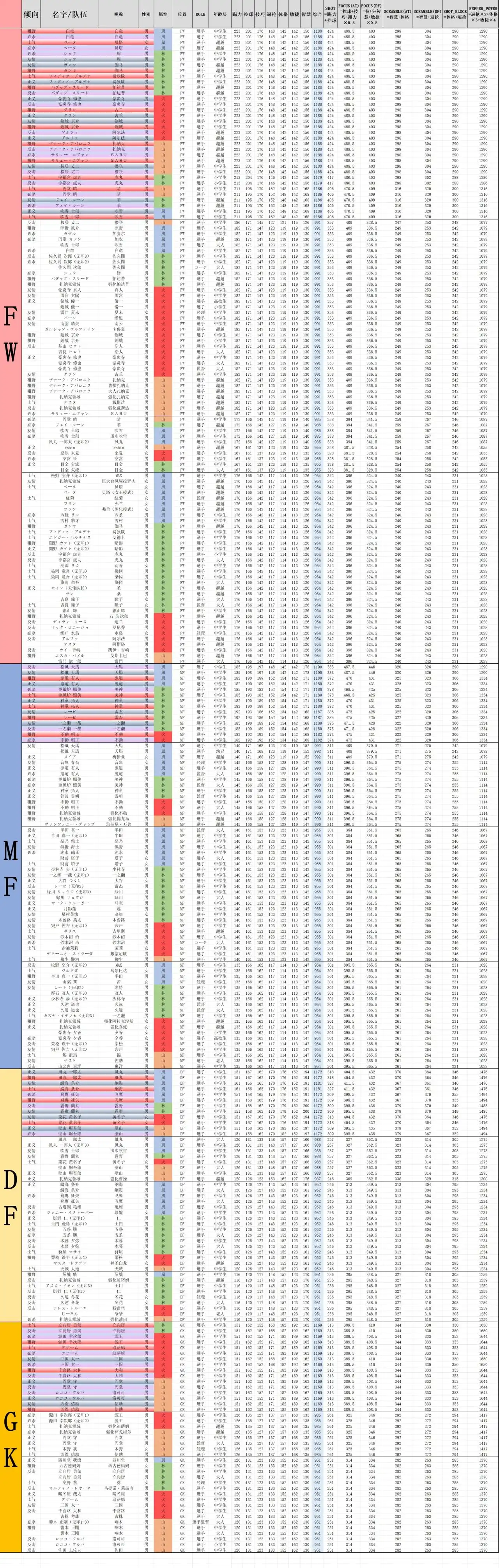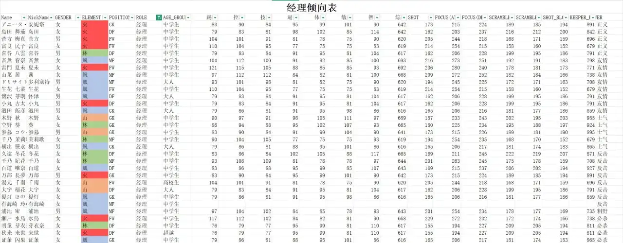 表格按照“风林火山”“FW-MF-DF-GK”四个顺序分别排列好了,正常推荐四属性FW和四属性DF都需要有,萌新推荐在A档位的各位置中挑选四个不同属性的人进行阵容搭建。